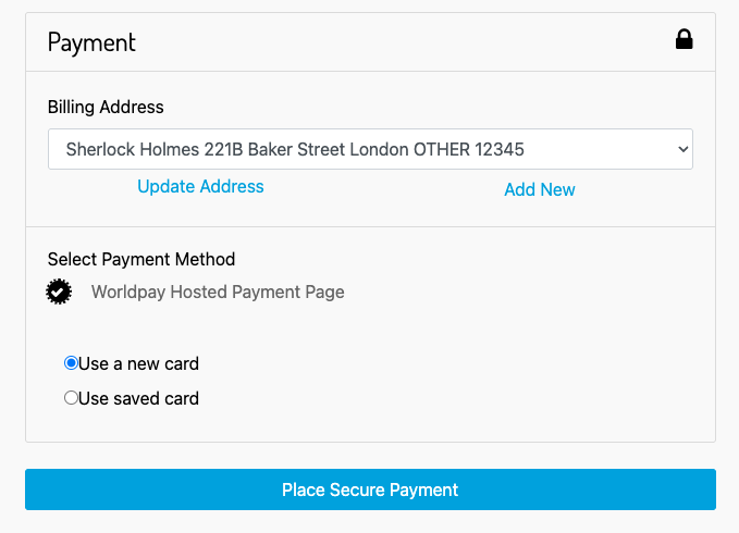 - If your customer already has a card token stored on their account it will be displayed on the checkout page. They will have the option to either use it or to use a new card.